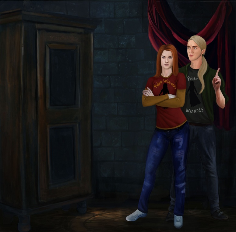Страница фанарта Драко и Джинни возле Исчезательного шкафа. Выполнено Alle Alle.
