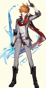 Протагонист "Геншин Импакта". Пол персонажа выбирается игроком. После столкновения с Неизвестным Богом просыпается в Тейвате в одиночестве и через два месяца вылавливает из моря Паймон. Проведя с Паймон некоторое время, рассказывает ей свою историю. Её цель — найти Итэра. Элемент адаптивен, оружие — меч. | Одиннадцатый Предвестник Фатуи, искусный воин родом из Снежной. Настоящее имя — Аякс. Элемент — Гидро, оружие — лук. |